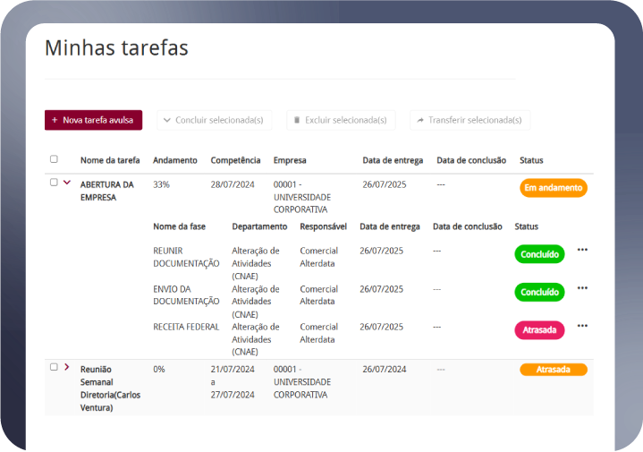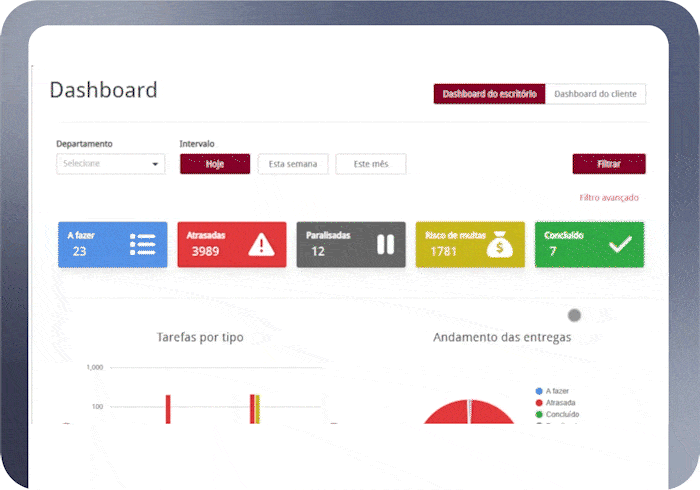 Nosso Dashboard analítico tenha uma visão instantânea do status de todas as tarefas: A fazer, Em atraso, Risco de multas e Concluídas. Filtre por departamento, período ou responsável, identifique gargalos rapidamente e tome decisões com base em dados concretos.